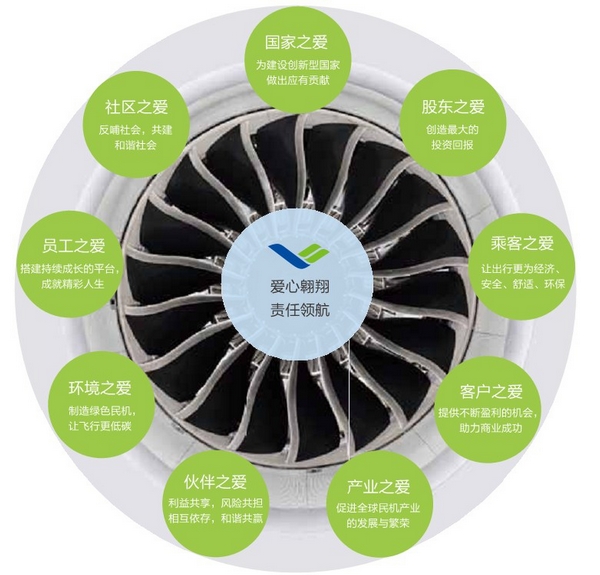 中國商飛公司將社會(huì )責任理念融入企業(yè)發(fā)展戰略,明確將履行社會(huì )責任定位為企業(yè)經(jīng)營(yíng)的發(fā)展重點(diǎn)之一,并從企業(yè)文化、社會(huì )責任管理體系、社會(huì )責任工作體系、社會(huì )責任報告制度、社會(huì )公益事業(yè)等五個(gè)方面進(jìn)行具體工作部署。